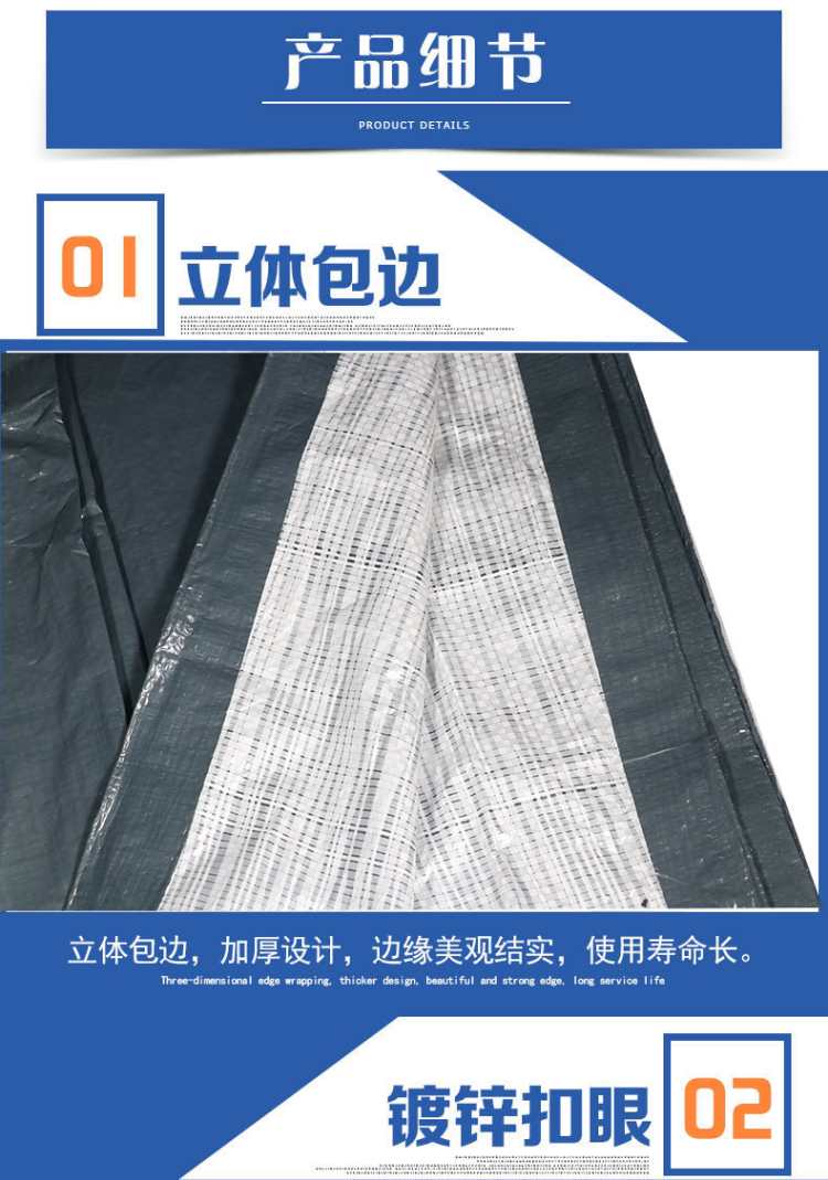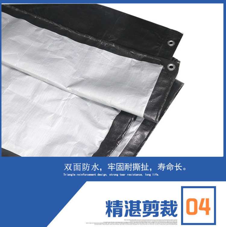黑白色PE防水篷布立體包邊,加厚設(shè)計(jì),邊緣美觀結(jié)實(shí),使用壽命長,鍍鋅扣眼