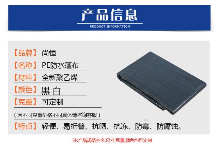 產(chǎn)品介紹黑白色PE防水篷布產(chǎn)品信息黑白色PE防水篷布立體包邊,加厚設(shè)計(jì),邊緣美觀結(jié)實(shí),使用壽命長,鍍鋅扣眼黑白色PE防水篷布牢固包角,···